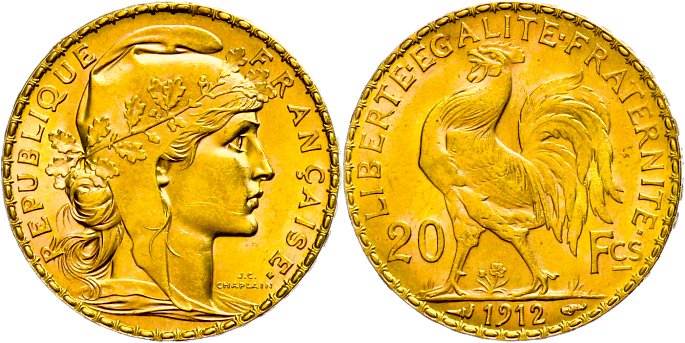 Die in den Jahren 1906 bis 1914 millionenfach geprägte Goldmünze zu 20 Francs ist wie die 1- und 4-Dukaten-Stücke Österreichs, eine ebenfalls häufig vorkommende Goldmünze. Besonders Prägungen ab dem Jahrgang 1907 kommen vermehrt vor. Leicht zu erkennen ist diese Münze anhand ihres schönen Motivs - des gallischen Hahns auf der Rückseite (Revers). Das Feingewicht beträgt 5,80g und besitzt praktisch keinen Sammlerwert. Wie so viele Goldmünzen aus dieser Zeit, wird auch diese Münze nahe am Goldpreis gehandelt.